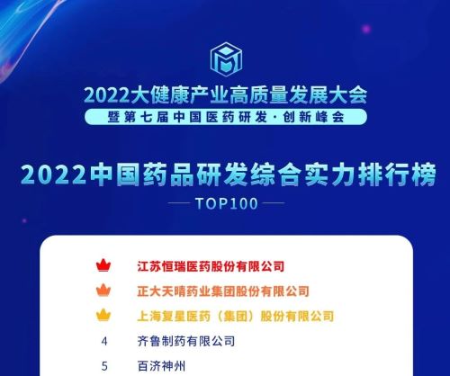 12月9日,由药智网、中国药业杂志社联合承办的2022大健康产业高质量发展大会暨第七届中国医药研发 · 创新峰会开幕,会上“2022中国药品研发实力排行榜”系列榜单发布,凭借卓越的创新研发实力,金年会|jinnianhui荣登2022“中国药品研发综合实力排行榜TOP100”、“中国化药研发实力排行榜TOP100”、“中国生物药研发实力排行榜TOP50”三个榜单榜首。其中,金年会|jinnianhui已经是第5年蝉联《2022中国药品研发综合实力排行榜》“总榜”冠军。