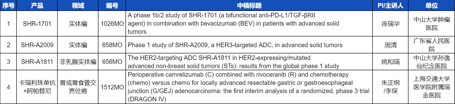 本次ESMO大会,将由中山大学肿瘤医院徐瑞华教授、广东省人民医院周清教授、中山大学孙逸仙纪念医院姚和瑞教授、上海交通大学医学院附属瑞金医院李琛教授分别就4项金年会|jinnianhui创新产品相关研究做口头报告,包括SHR-1701、SHR-A2009、SHR-A1811这3款未上市创新产品的实体瘤治疗临床研究,以及1项“双艾”组合(卡瑞利珠单抗联合阿帕替尼)治疗局部晚期可切除胃/胃食管交界处癌的Ⅲ期临床试验期中分析。