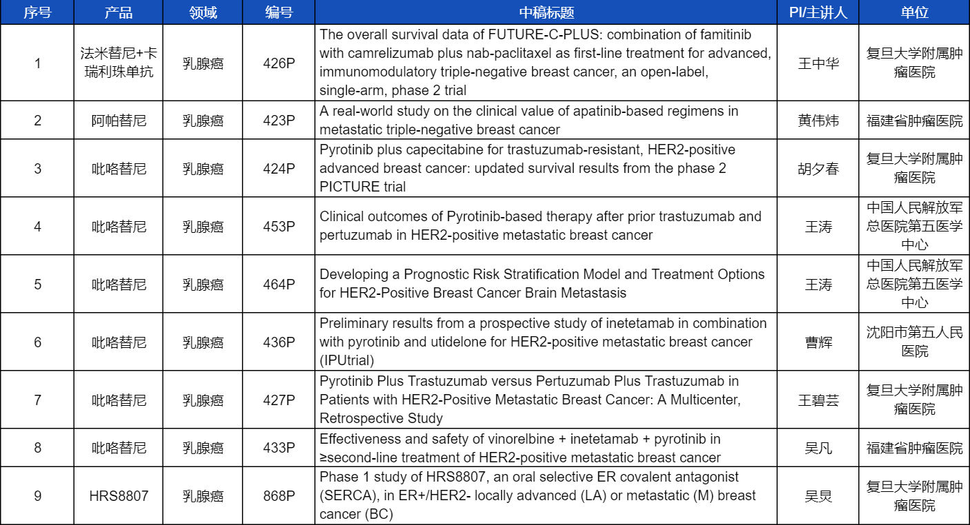 12款抗肿瘤创新药包括6款已上市产品:注射用卡瑞利珠单抗(艾瑞卡®)、甲磺酸阿帕替尼片(艾坦®)、马来酸吡咯替尼片(艾瑞妮®)、阿得贝利单抗注射液(艾瑞利®)、氟唑帕利胶囊(艾瑞颐®)、瑞维鲁胺片(艾瑞恩®),以及6款未上市产品:多靶点受体酪氨酸激酶抑制剂法米替尼、抗PD-L1/TGF-βRII双抗SHR-1701、组蛋白甲基转移酶EZH2抑制剂SHR2554、HER2抗体偶联药物(ADC)SHR-A1811、HER3抗体偶联药物SHR-A2009、新型选择性雌激素受体共价拮抗剂(SERCA)HRS8807等。此次ESMO大会的最新突破摘要(LBA)结果尚未披露,敬请期待!本文特对33项研究成果做了梳理,带领各位读者领略金年会|jinnianhui创新之光。