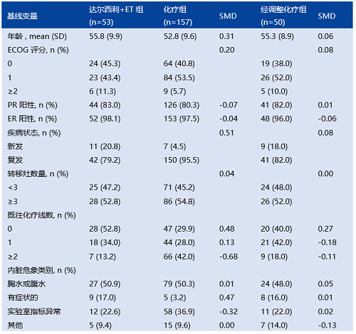 本研究使用真实世界数据作为外部对照组,选取接受化疗的HR+/HER2-晚期乳腺癌内脏危象患者(CT组)。这些数据来源于各中心的医院信息系统(HIS)。CT组的入组标准和排除标准与达尔西利+ET组相同。采用逆概率加权(IPTW)方法来评估试验组的平均治疗效应(ATT),并进行倾向评分调整,包括年龄、ECOG评分、复发、转移部位数量、既往晚期化疗线数和内脏危象类别。