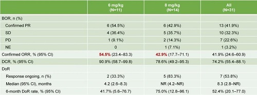 31例患者在研究治疗前接受过Her2 ADC治疗,其中41.9%(13例)的患者有达到确认的部分缓解(PR)。在接受过Her2 ADC治疗的患者中,6mg/kg剂量组确认的ORR为54.5%(95% Cl:23.4-83.3),8mg/kg剂量组确认的ORR为42.9%(95% Cl:17.7-71.1)。