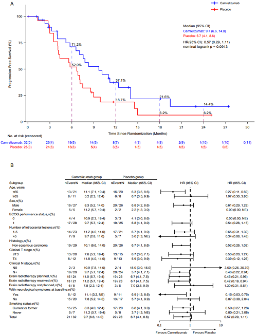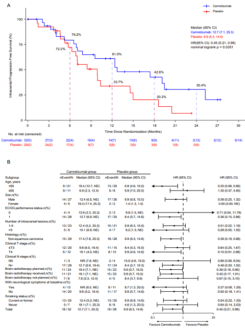 亚组分析,在联合颅内放疗的患者中(n=44),卡瑞利珠单抗组的中位iPFS为19.1个月,安慰剂组为9.9个月(HR:0.42,95% CI:0.17-1.01);中位PFS分别为11.2个月和6.7个月(HR:0.42,95% CI:0.19-0.94)。