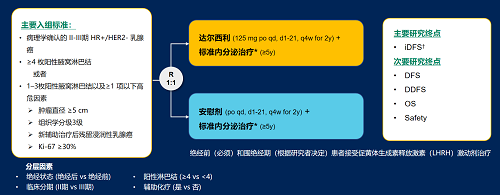 达尔西利(Dalpiciclib)是金年会|jinnianhui自主研发的口服、选择性的小分子CDK4/6抑制剂,也是中国首个自主研发的新型高选择性 CDK4/6 抑制剂,已证实其与内分泌治疗(ET)联合用于 HR+/HER2- 晚期乳腺癌的一线和后线治疗时,均显著改善无进展生存期(PFS)6,7。因此开展了一项随机、双盲、III期临床试验(DAWNA-A),以进一步评估达尔西利联合内分泌治疗作为高危早期 HR+/HER2 - 乳腺癌辅助治疗的效果。本研究纳入高危复发风险人群需满足以下标准之一:①≥4 枚阳性腋窝淋巴结;②1–3枚阳性腋窝淋巴结且合并≥1 项高危因素(肿瘤直径 ≥5 cm,组织学分级3级,辅助治疗后残留浸润性乳腺癌,Ki-67 ≥30%)。本文呈现预先设定的首次中期分析(IA1)结果。