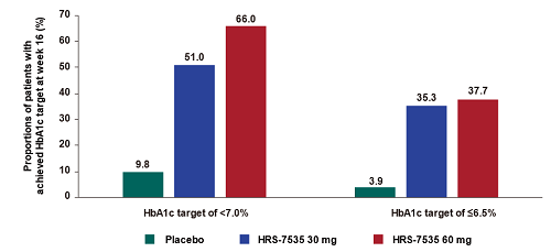 ● HRS-7535治疗组,HbA1c<7.0%(一般控制目标)的达标率达66.0%: