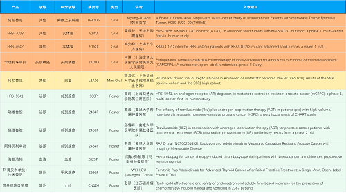 在胸腺上皮肿瘤、头颈鳞癌、肉瘤、前列腺癌、甲状腺癌等其他多个疾病领域,卡瑞利珠单抗、阿帕替尼、瑞维鲁胺、阿得贝利单抗、法米替尼、HRS-7058、HRS-4642、HRS-5041等抗肿瘤创新药相关研究一共入选了4项口头报告、1项简短口头报告、5项壁报,彰显了金年会|jinnianhui强大的研发实力。此外,海曲泊帕和昂丹司琼口溶膜分别在防治化疗导致的血小板减少和恶心呕吐方面各有1项研究入选壁报。