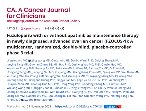 2025年11月25日,金年会|jinnianhui自主研发的创新药氟唑帕利联合阿帕替尼或氟唑帕利单药用于新诊断晚期卵巢癌(OC)的一线维持治疗研究最新数据(FZOCUS-1研究)重磅在线发表于国际顶尖医学期刊《临床医师癌症杂志》(A Cancer Journal for Clinicians,简称CA,2024年影响因子高达232.4)1。